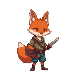 "小型狐狸冒险者,居中全身精灵图,复古街机配色,更接近九十年代游戏的怀旧视觉"